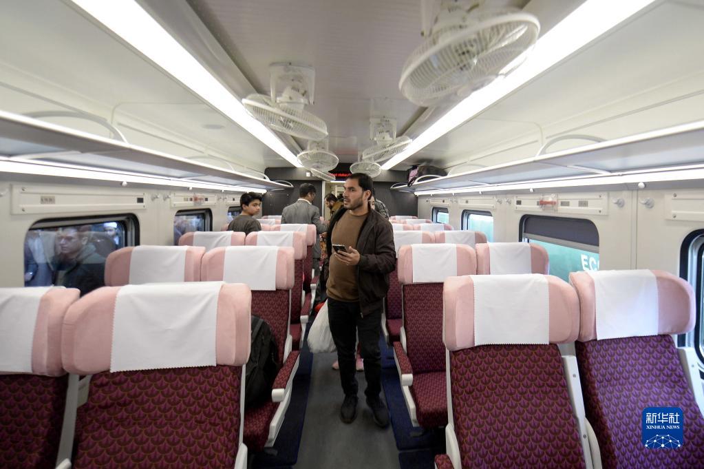 1月27日,乘客在巴基斯坦伊斯蘭堡登上綠線(xiàn)特快列車(chē)組的中國進(jìn)口鐵路客車(chē)。
