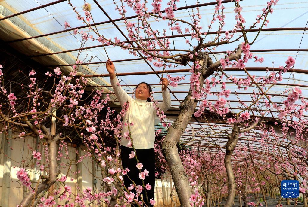 1月28日,在甘肅省平?jīng)鍪徐o寧縣城川鎮吳廟村的暖棚里,桃花競相綻放,果農在給桃花授粉。
