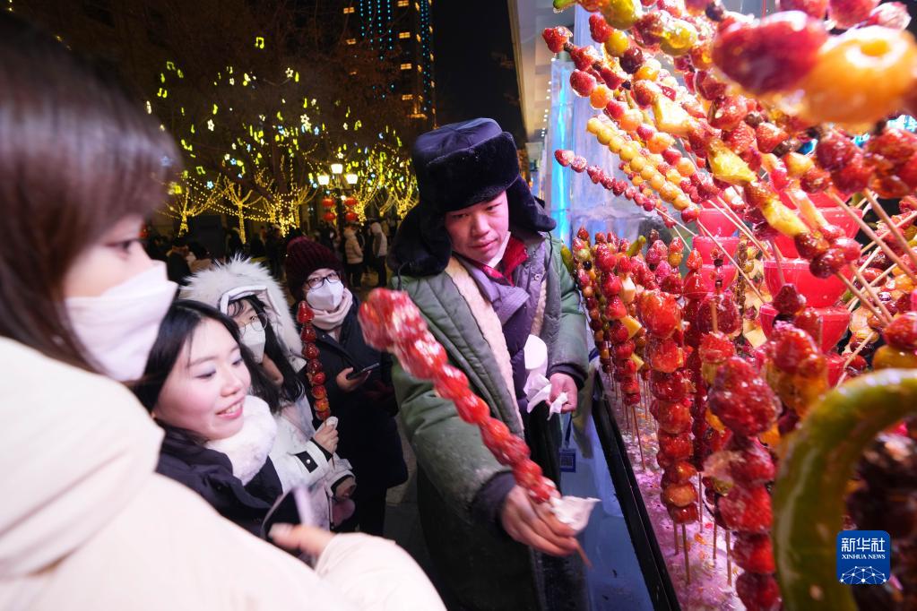 1月28日,游客在哈爾濱中央大街的“冰屋集市”上購買(mǎi)糖葫蘆。