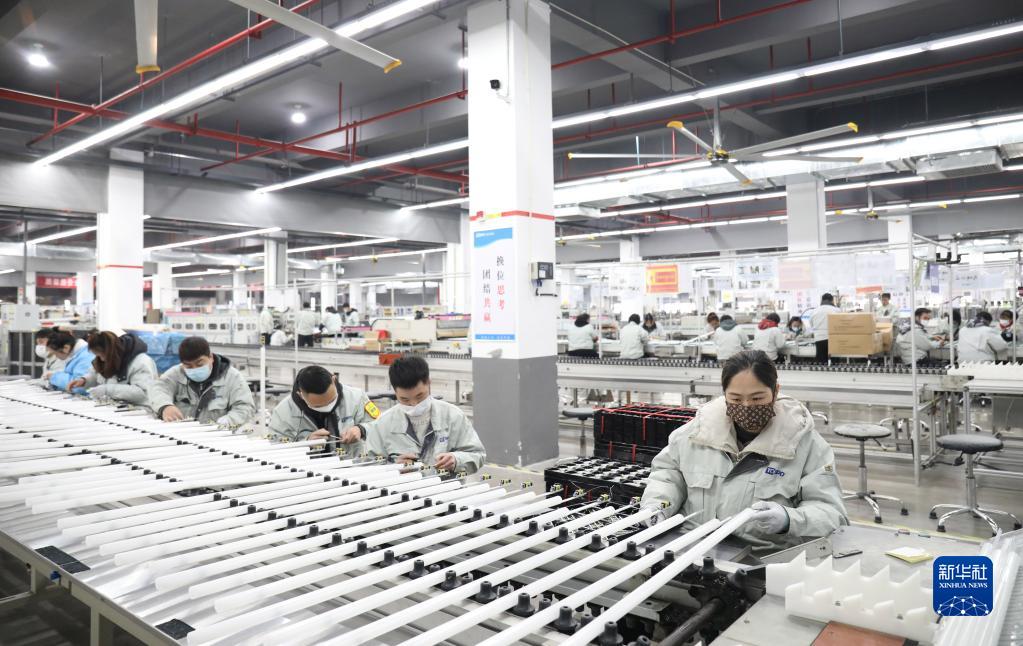 1月29日,浙江省東陽(yáng)市橫店集團得邦照明股份有限公司的員工在生產(chǎn)線(xiàn)上作業(yè)。