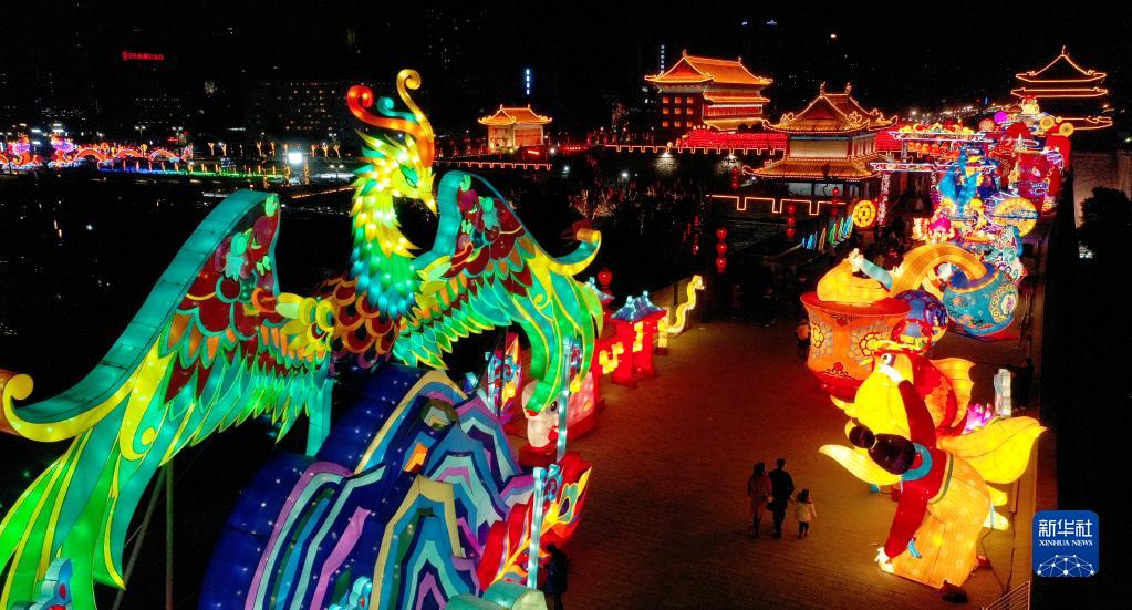 這是1月26日在西安城墻拍攝的花燈(無(wú)人機照片)。