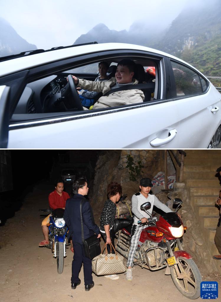 拼版照片:上圖為2023年1月28日,在弄勇村弄朝屯,村民藍有平駕車(chē)去廣州務(wù)工;下圖為2015年2月28日凌晨,藍有平(左二)準備搭摩托車(chē)到鄉里換乘班車(chē),前往廣州務(wù)工。