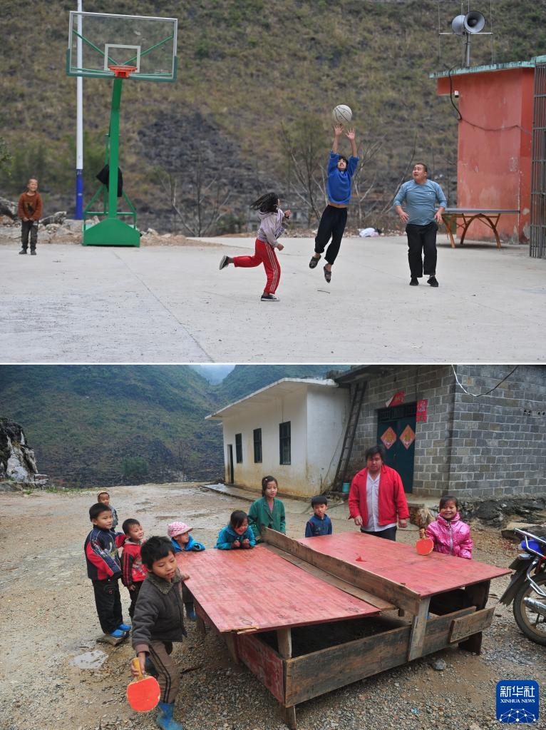 拼版照片:上圖為2023年1月15日,在弄勇村弄頂教學(xué)點(diǎn),返鄉過(guò)年的藍財宏(右一)和孩子們在新建的籃球場(chǎng)上打籃球;下圖為2012年12月27日,在弄頂教學(xué)點(diǎn),時(shí)任代課老師的藍財宏(右二)和學(xué)生們在簡(jiǎn)易球桌上打乒乓球。