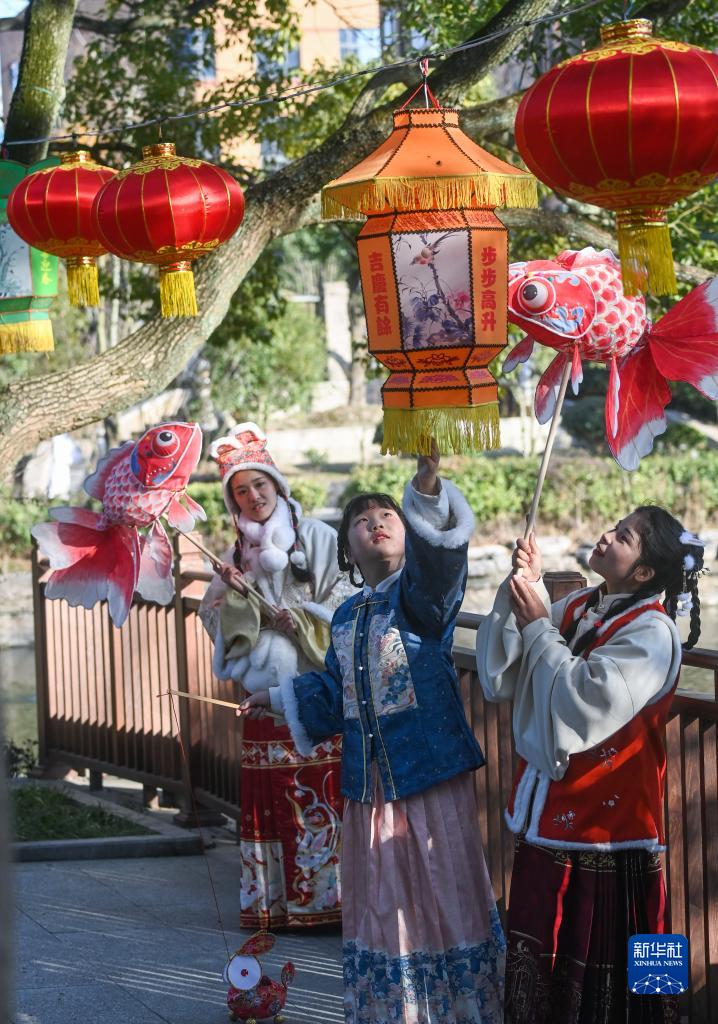 1月29日,在嘉興市秀洲區新塍古鎮小蓬萊公園內,身著(zhù)傳統服飾的游客在“鰲山燈會(huì )”現場(chǎng)觀(guān)賞花燈。