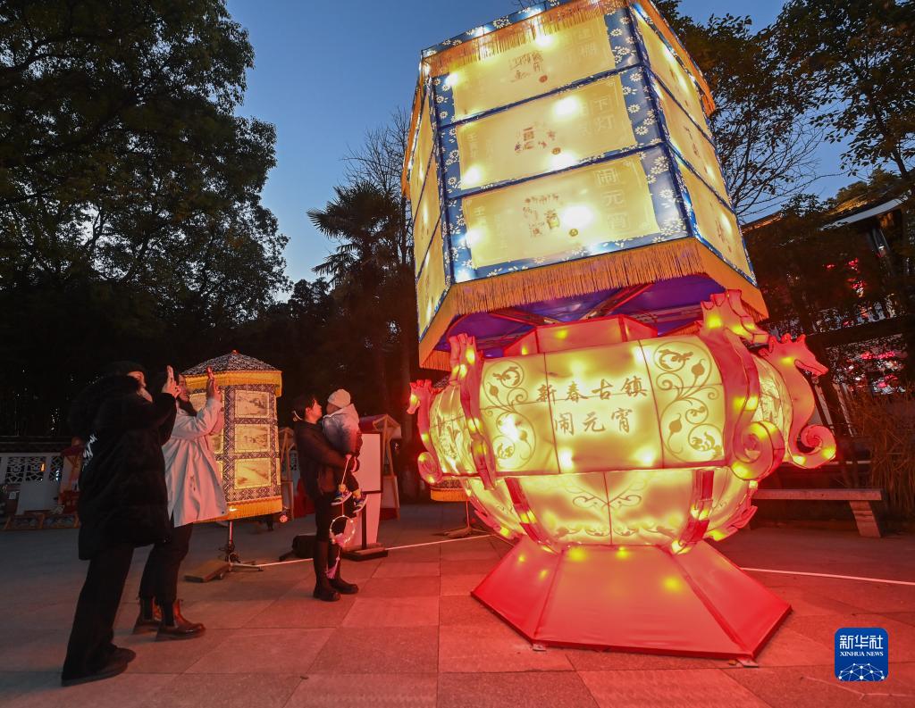 1月29日,在嘉興市秀洲區新塍古鎮小蓬萊公園內,人們在觀(guān)賞“鰲山燈會(huì )”的彩燈。