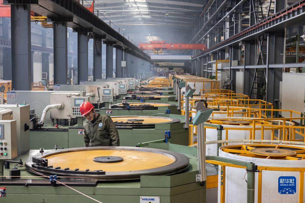 1月29日,浙江省諸暨市店口鎮浙江海亮股份有限公司盤(pán)管車(chē)間的工人在生產(chǎn)線(xiàn)上工作。