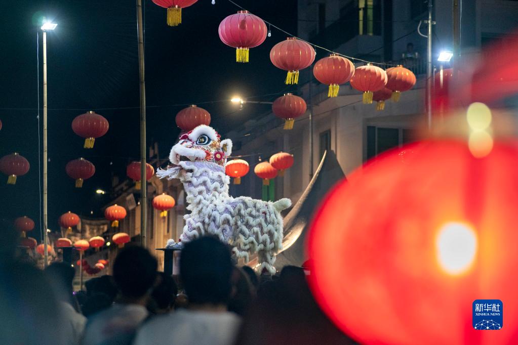 這是1月28日在馬來(lái)西亞檳城州首府喬治市舉行的檳城廟會(huì )上拍攝的舞獅表演。