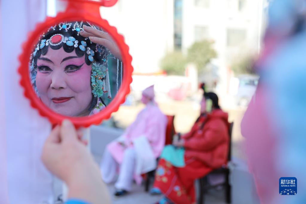 1月29日,在溫縣文化廣場(chǎng),演員在演出前化裝。