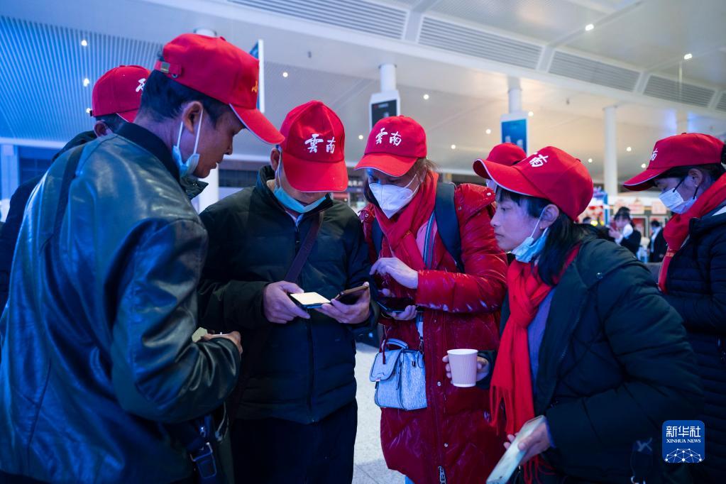 1月30日,幾名務(wù)工人員在昆明南站候車(chē)廳核對信息。