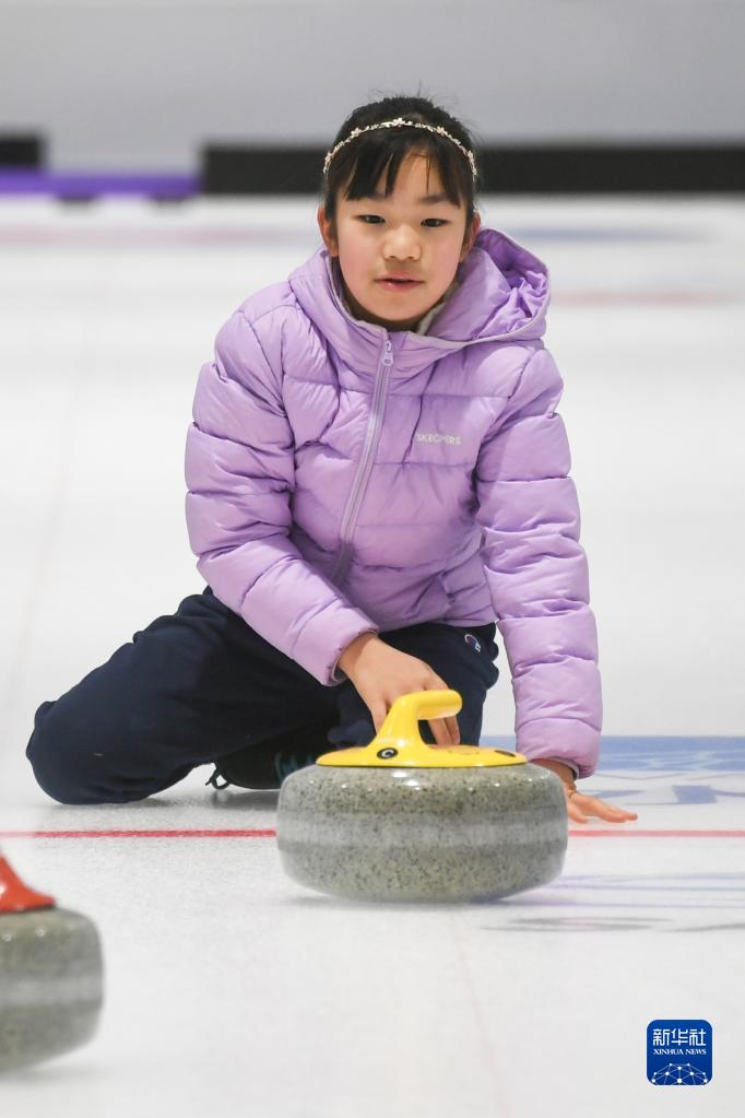 1月29日,一名參加冰壺專(zhuān)業(yè)培訓班的小朋友在“冰立方”冰上運動(dòng)中心練習投壺。