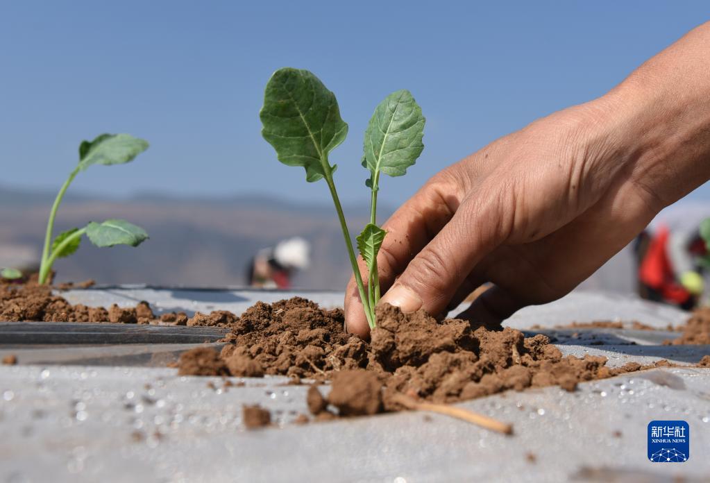 1月29日,在云南省大理白族自治州鶴慶縣辛屯鎮西蘭花種植基地,村民在移栽蔬菜苗。