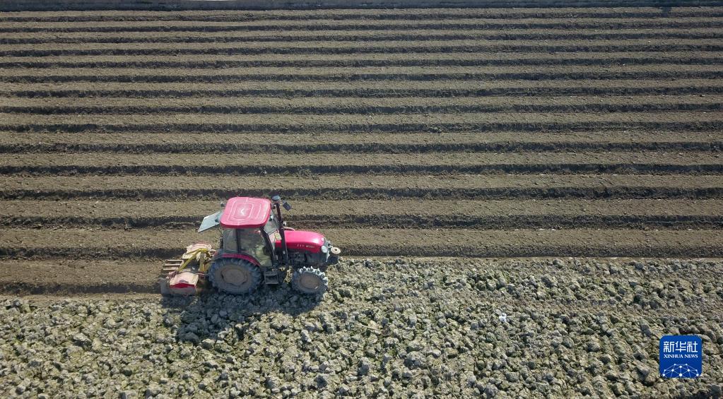 1月29日,廣西賀州市平桂區鵝塘鎮鵝塘村農民駕駛拖拉機犁田(無(wú)人機照片)。