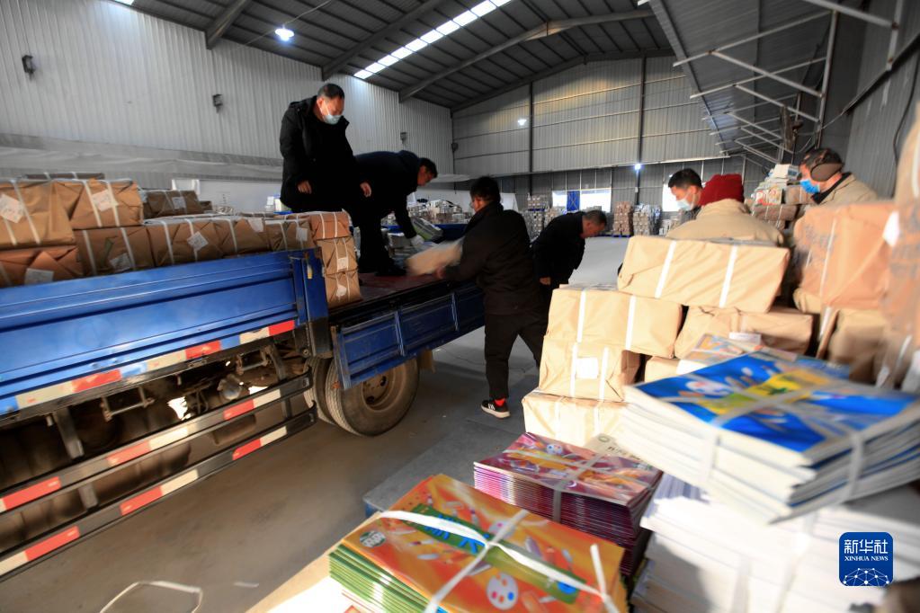 1月30日,在山東省臨沂市平邑縣新華書(shū)店倉庫,工作人員在搬運教材。