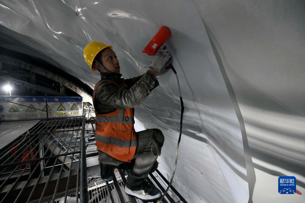 1月30日,在首都地區環(huán)線(xiàn)高速公路承德至平谷段楊家窩鋪特長(cháng)隧道施工現場(chǎng),工人在鋪設防水板。