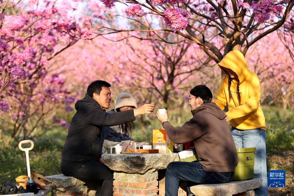 1月29日,在江門(mén)市新會(huì )區大澤鎮山頭坪,游客在花海中泡茶。