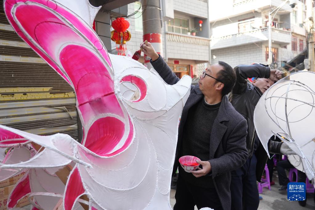 1月30日,民間藝人在貴州省黔東南苗族侗族自治州臺江縣臺拱街道文山村給“亮龍”的龍頭添色。