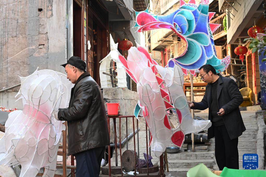 1月30日,民間藝人在貴州省黔東南苗族侗族自治州臺江縣臺拱街道文山村編扎“亮龍”。