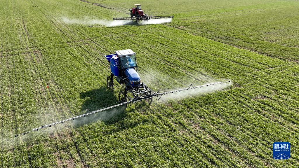 1月30日,在安徽省亳州市利辛縣紀王場(chǎng)鄉和諧社區的麥田,農民駕駛農機對小麥進(jìn)行噴藥作業(yè)。