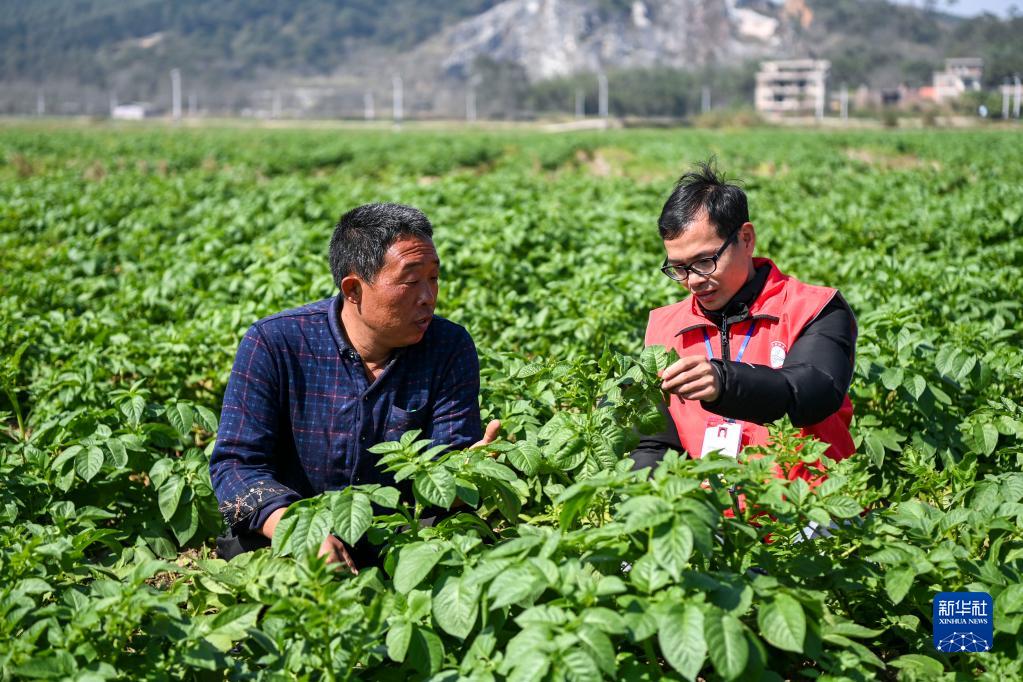 1月30日,在廣西興業(yè)縣石南鎮的一處農田里,當地農業(yè)部門(mén)的科技特派員(右)觀(guān)察農作物長(cháng)勢。