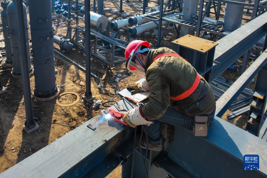 1月30日,工人在湖北省孝感市云夢(mèng)縣鹽化工循環(huán)利用產(chǎn)業(yè)園區進(jìn)行電焊作業(yè)(無(wú)人機照片)。