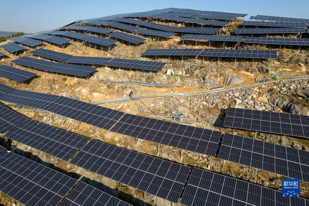 1月30日,工人在貴州省黔西市一光伏電站項目施工現場(chǎng)忙碌(無(wú)人機照片)。