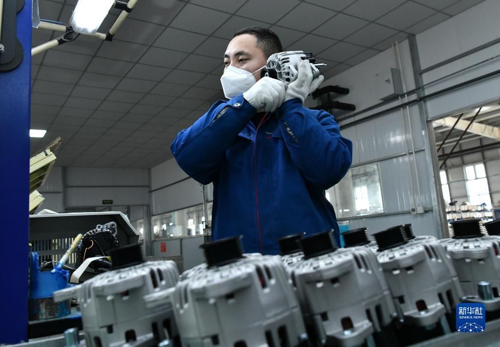 1月30日,工人在河間市一家再制造企業(yè)車(chē)間生產(chǎn)線(xiàn)上檢驗汽車(chē)發(fā)電機。