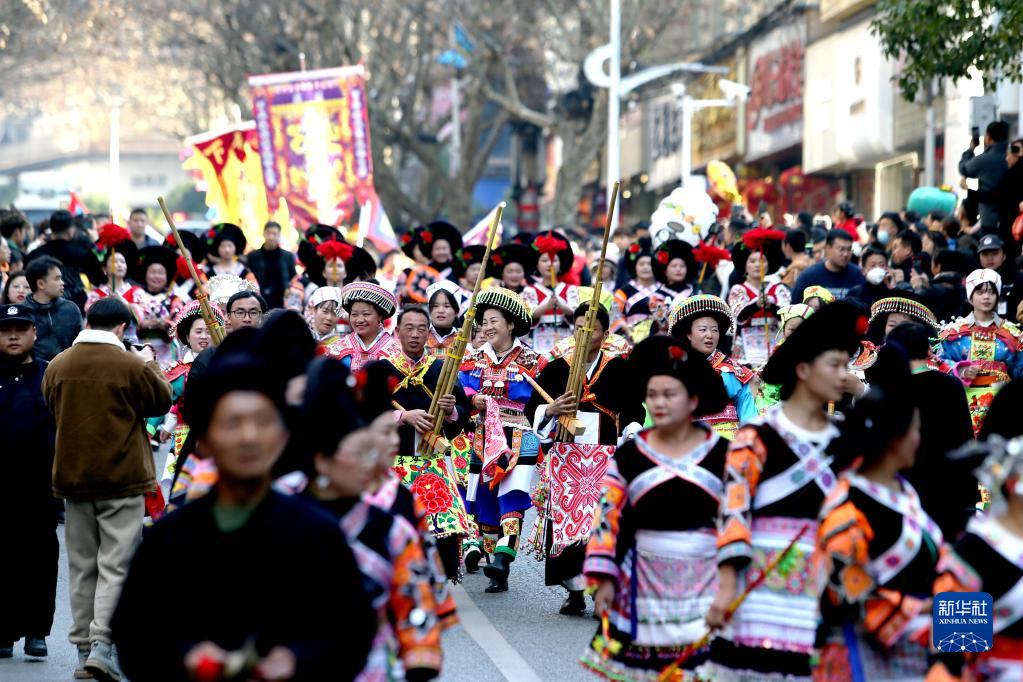 當日是正月初九,貴州省黔南布依族苗族自治州龍里縣舉辦傳統民俗“踩街”活動(dòng),通過(guò)花燈巡演、花棍舞、蘆笙舞、舞龍舞獅等民俗活動(dòng),歡度新春。