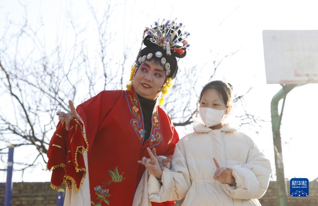 1月30日,在邢臺市襄都區北大街街道辦事處新興東社區,演員給孩子們講解非物質(zhì)文化遺產(chǎn)四股弦知識。