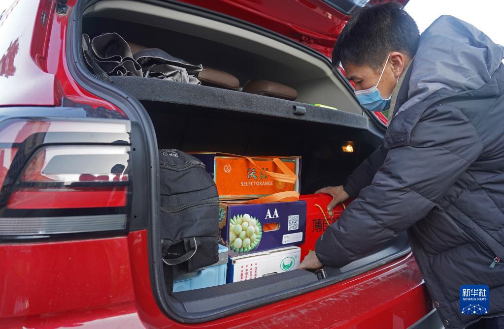在靖安縣,錢(qián)芳勇在整理為親生父母帶來(lái)的禮物(1月29日攝)。
