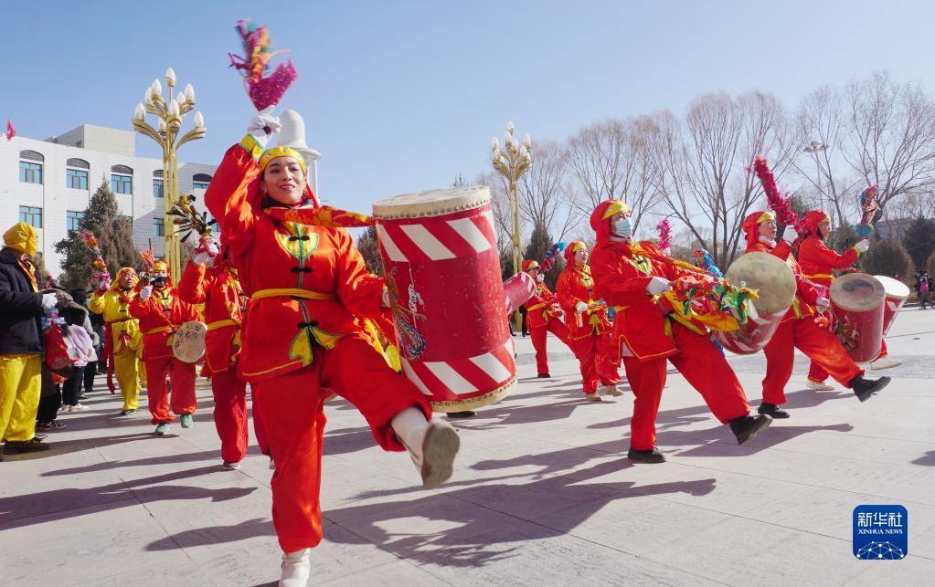 1月30日,甘肅省阿克塞哈薩克族自治縣社火隊在進(jìn)行太平鼓表演。