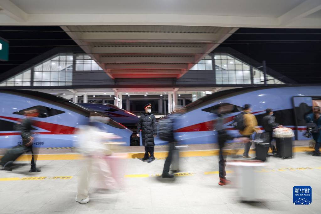 1月31日,務(wù)工人員在畢節高鐵站工作人員的引導下進(jìn)入站臺登車(chē)。