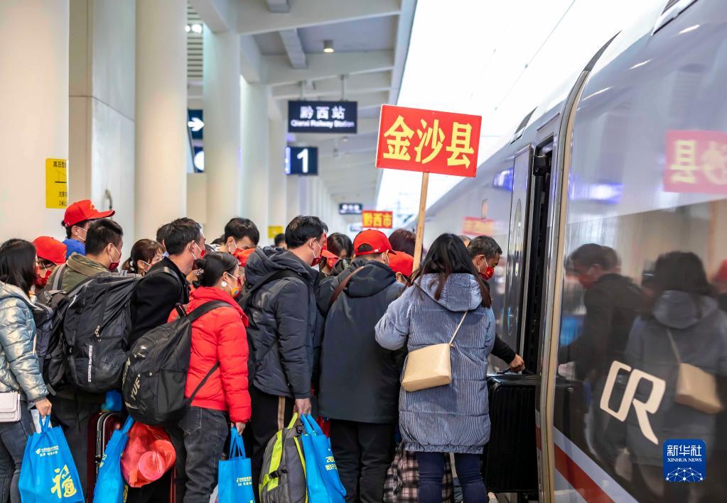 1月31日,務(wù)工人員在黔西高鐵站有序登車(chē)。