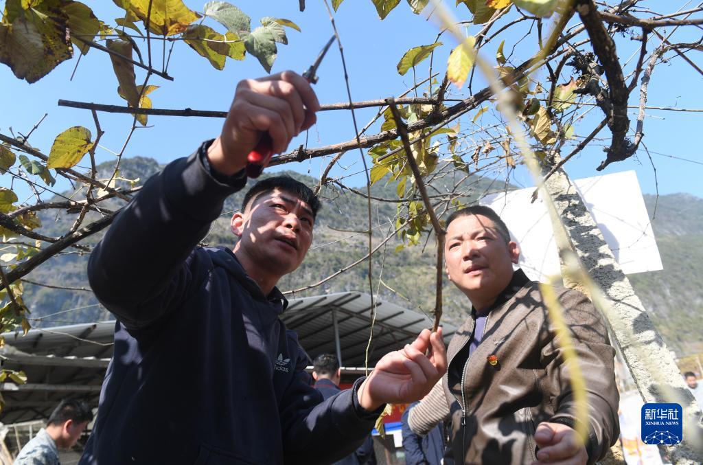 在菁盛鄉菁盛村,黃啟林(左)和在這里參加毛葡萄管護現場(chǎng)培訓的村民一起探討葡萄栽培技術(shù)(1月30日攝)。