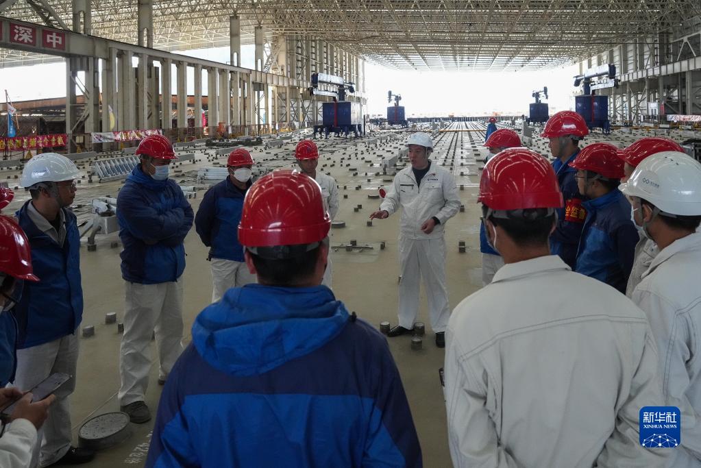 在中交四航局珠海牛頭島沉管智慧工廠(chǎng),施工人員為深中通道海底隧道最后一個(gè)管節(非標準管節、含最終接頭)布置澆筑工作(1月30日攝)。