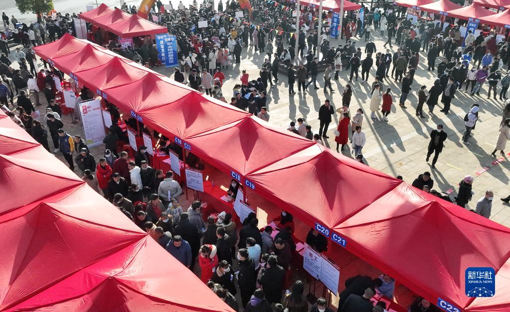 1月31日,在湖南省衡陽(yáng)市衡山縣體育廣場(chǎng),求職者在衡陽(yáng)市2023年春風(fēng)行動(dòng)暨就業(yè)援助月專(zhuān)場(chǎng)招聘會(huì )上尋找合適的崗位(無(wú)人機照片)。