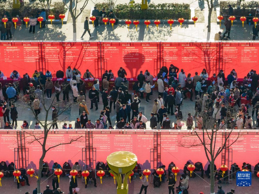 1月31日,求職者在安徽省合肥市肥東縣店埠鎮和平文化廣場(chǎng)“暖民心·促就業(yè)”春風(fēng)行動(dòng)專(zhuān)場(chǎng)招聘會(huì )現場(chǎng)了解招聘信息(無(wú)人機照片)。