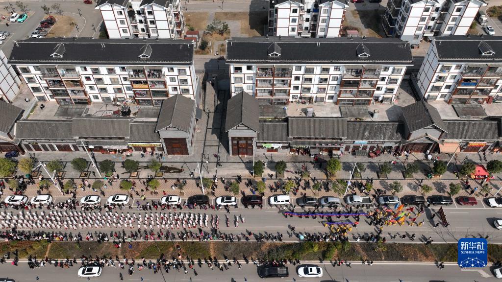 1月31日,苗族同胞在貴州省黔東南苗族侗族自治州黃平縣谷隴鎮盛裝巡游(無(wú)人機照片)。