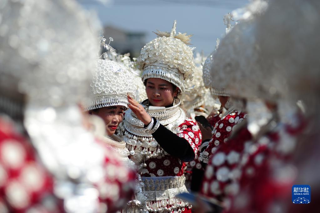 當日,在貴州省黃平縣谷隴鎮,26個(gè)村(居)的千余名苗族同胞身著(zhù)銀飾盛裝,跳板凳舞、吹蘆笙、唱苗歌,載歌載舞喜迎元宵佳節。