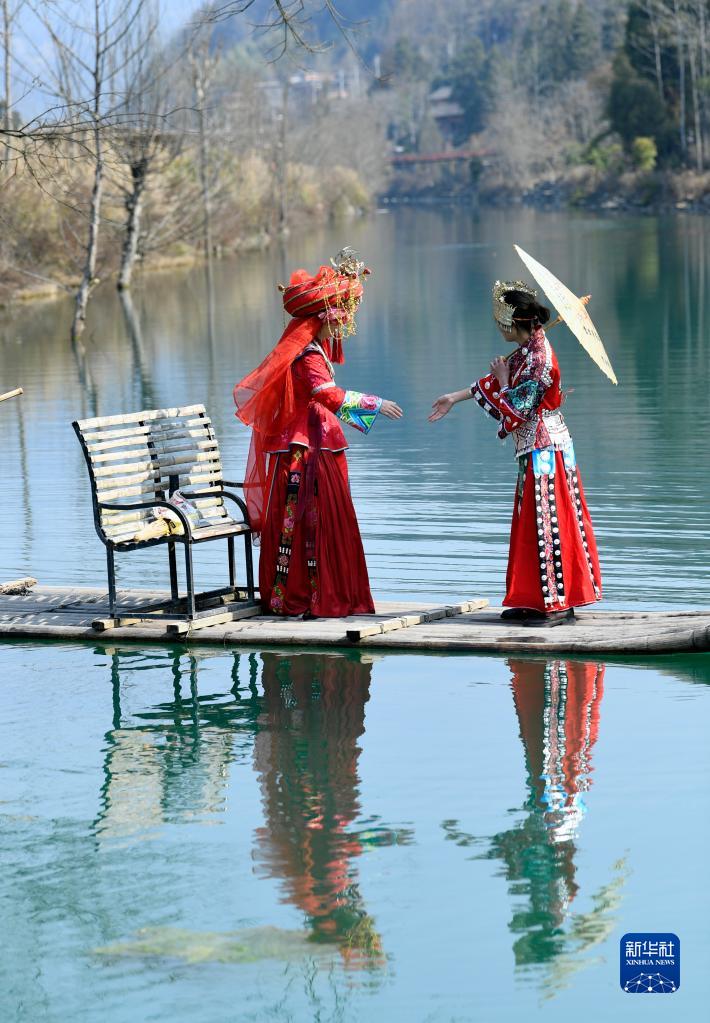 在鄂西山區湖北省宣恩縣的彭家寨古吊腳樓前,一條小河碧波蕩漾。古色古香的吊腳樓、清澈見(jiàn)底的河水、晃晃悠悠的吊橋,構成一幅“小橋流水人家”的鄉村畫(huà)卷,吸引游客前往賞景游玩。