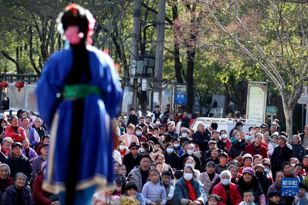 1月30日,在湖南省資興市人民廣場(chǎng),居民在臺下欣賞花鼓戲。