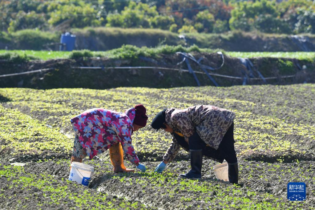 1月30日,在福州市閩侯縣南通鎮蔬菜種植區,兩位菜農給菜苗除草。