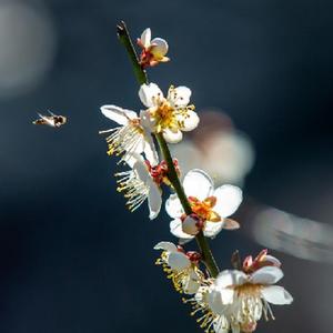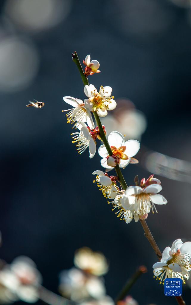 1月31日,福建武夷山景區盛開(kāi)的梅花,吸引蜜蜂來(lái)采蜜。