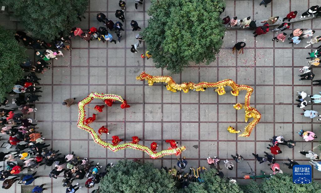 1月31日,藝人在湖南省衡陽(yáng)市珠暉區東風(fēng)街道前進(jìn)里社區表演舞龍(無(wú)人機照片)。