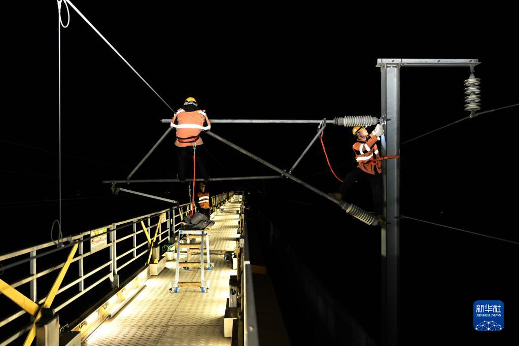 春運期間,中國鐵路上海局集團有限公司南京供電段接觸網(wǎng)維修車(chē)間的接觸網(wǎng)工們冒著(zhù)寒風(fēng),搶抓凌晨“天窗”時(shí)段,對接觸網(wǎng)設備展開(kāi)全方位檢修,排除隱患,確保列車(chē)通行安全。