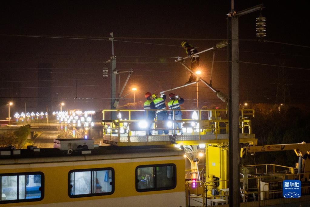 鐵路接觸網(wǎng)供電設備是否正常運轉,關(guān)系著(zhù)每趟列車(chē)的安全運行。春運期間,中國鐵路武漢局集團有限公司武漢供電段高鐵接觸網(wǎng)檢修工人利用0點(diǎn)到6點(diǎn)的“天窗點(diǎn)”,頭戴安全帽、身穿反光服,對京廣高鐵武漢段的接觸網(wǎng)進(jìn)行檢修、維護,為高鐵供電保駕護航。