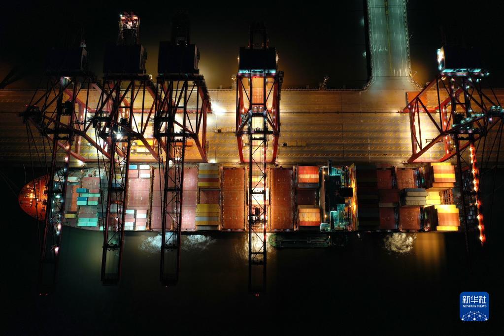 一艘貨輪??吭趯幉ㄖ凵礁鄞┥礁蹍^集裝箱碼頭(1月31日攝,無(wú)人機照片)。