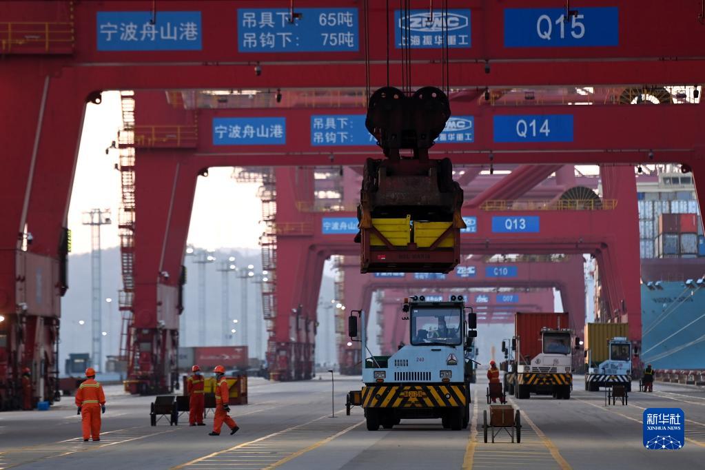 1月31日,卡車(chē)在寧波舟山港穿山港區集裝箱碼頭裝卸。