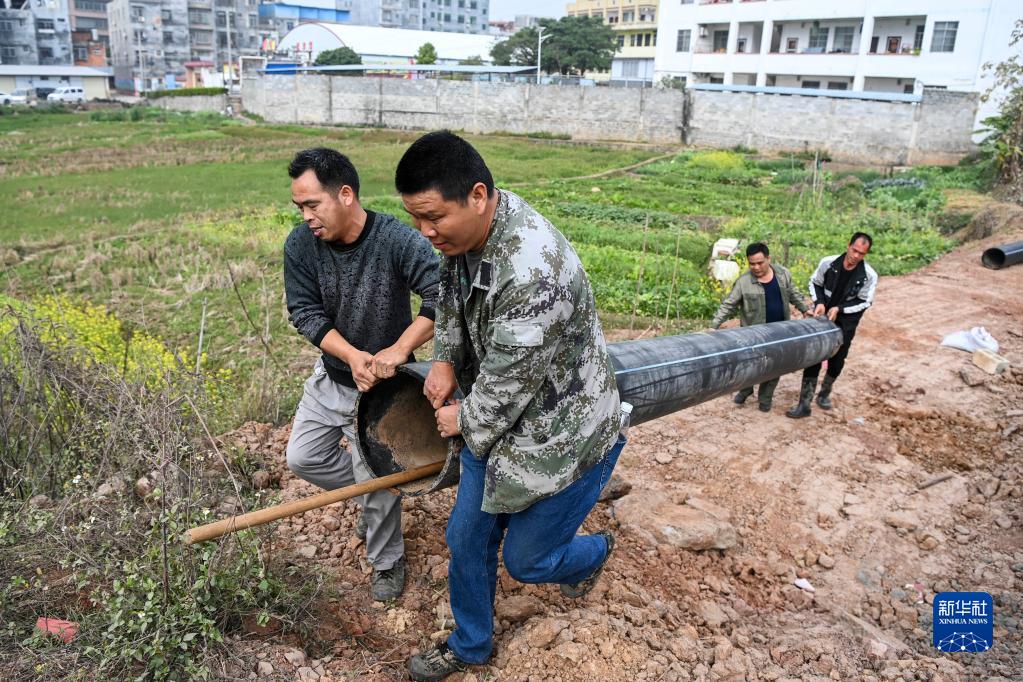 2月1日,廣西興業(yè)縣沙塘鎮的黨員干部群眾一起搬運輸水管道。