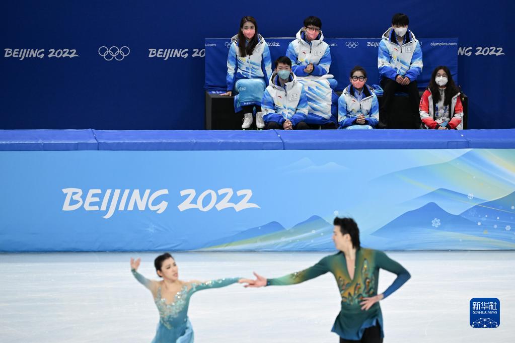 在北京冬奧會(huì )花樣滑冰冰舞自由舞比賽時(shí),楊曦(上 左二)和其他志愿者在場(chǎng)邊等候(2022年2月14日攝)。