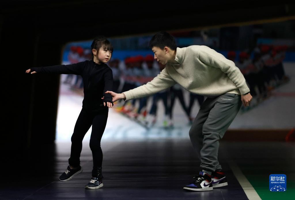 楊曦(右)在陸地訓練課上為8歲的小學(xué)員鄭詩(shī)琪指導花樣滑冰技術(shù)動(dòng)作(1月15日攝)。